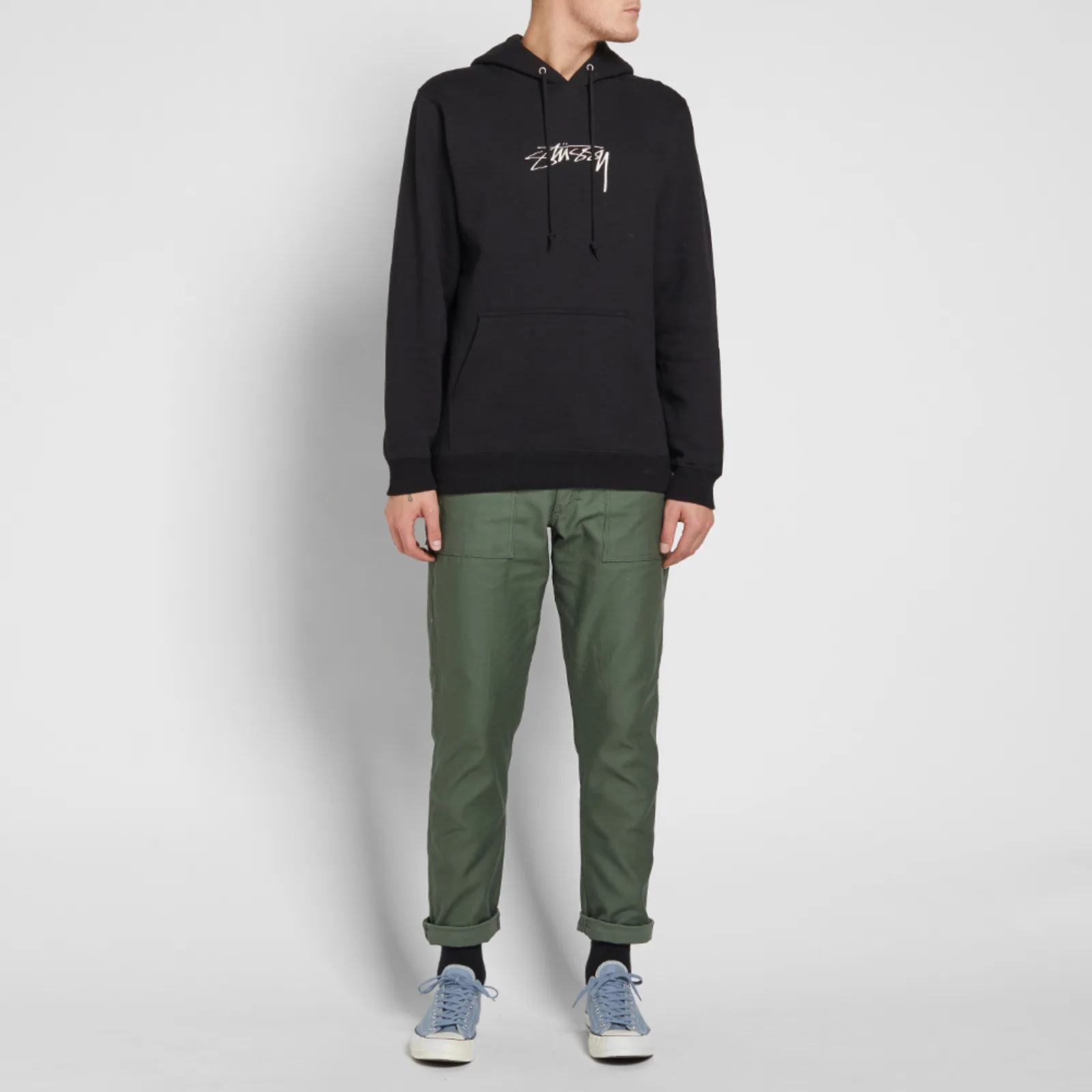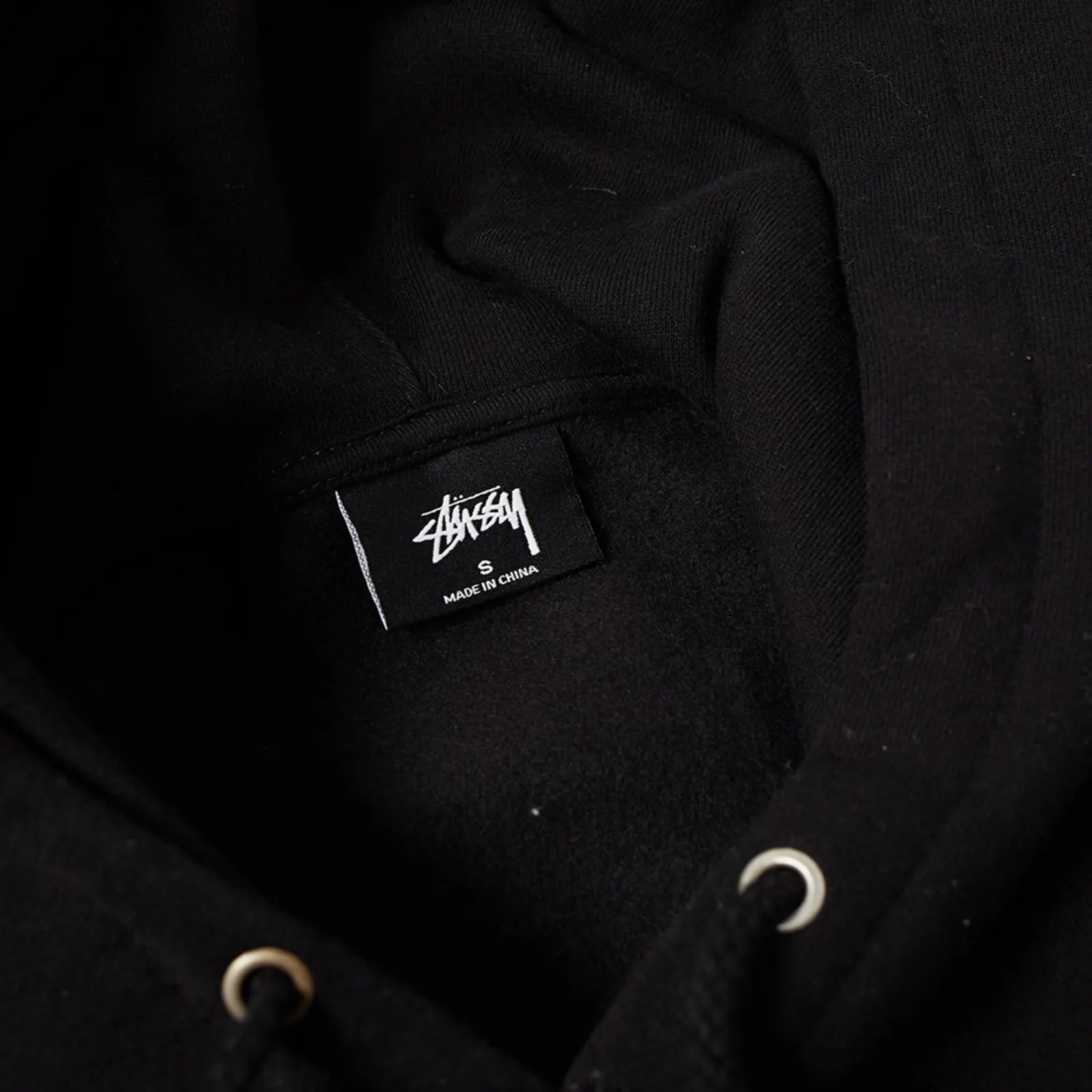 - Smooth black appliqué “Stussy” logo spread across chest
