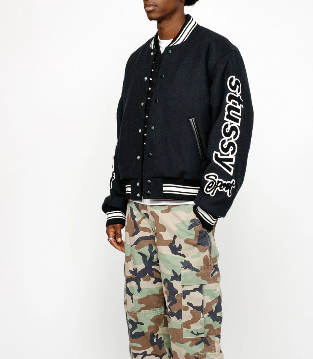 - Premium black varsity jacket with bold Stussy “Sport” logo on sleeves