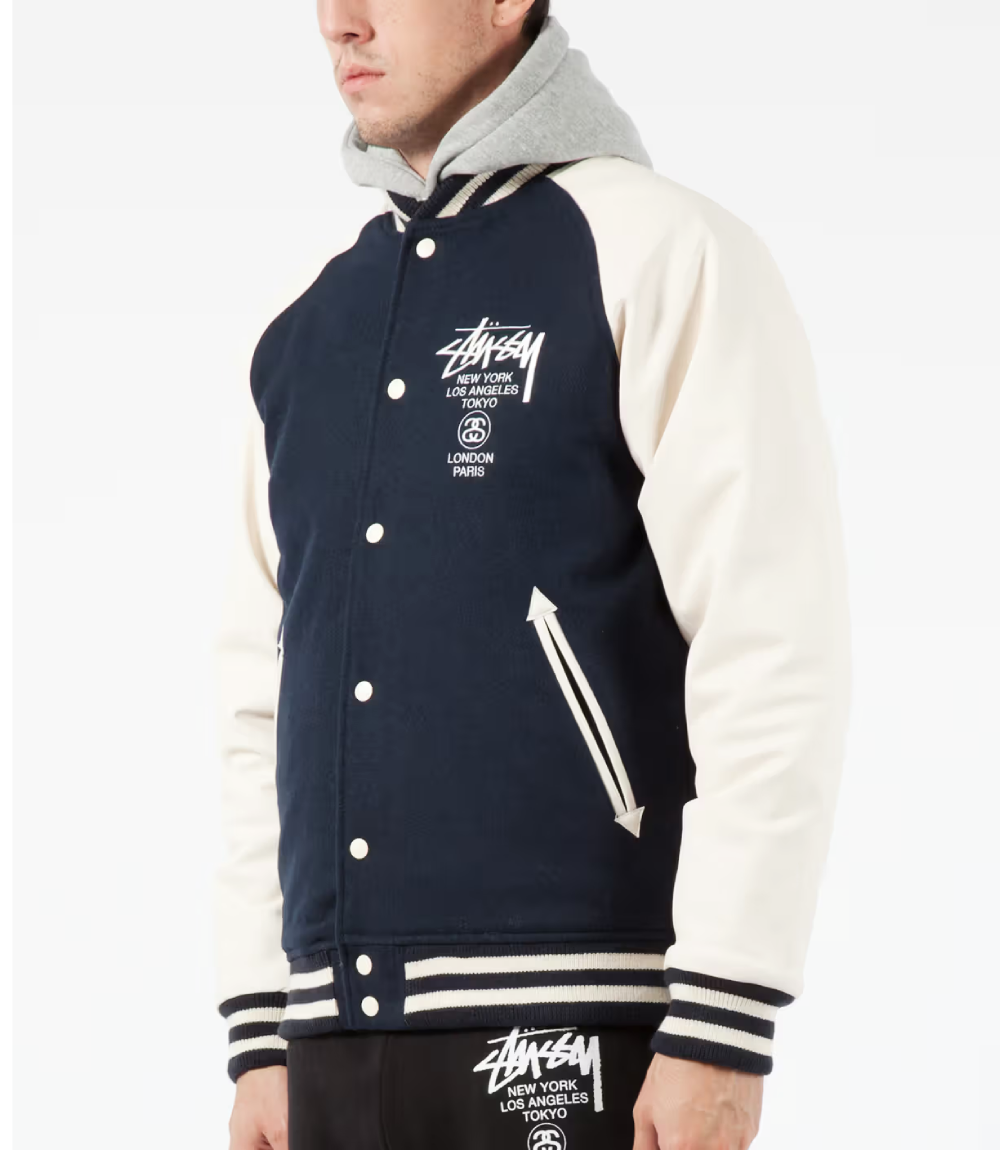Stussy World Tour Navy Wool And Leather Varsity Jacket